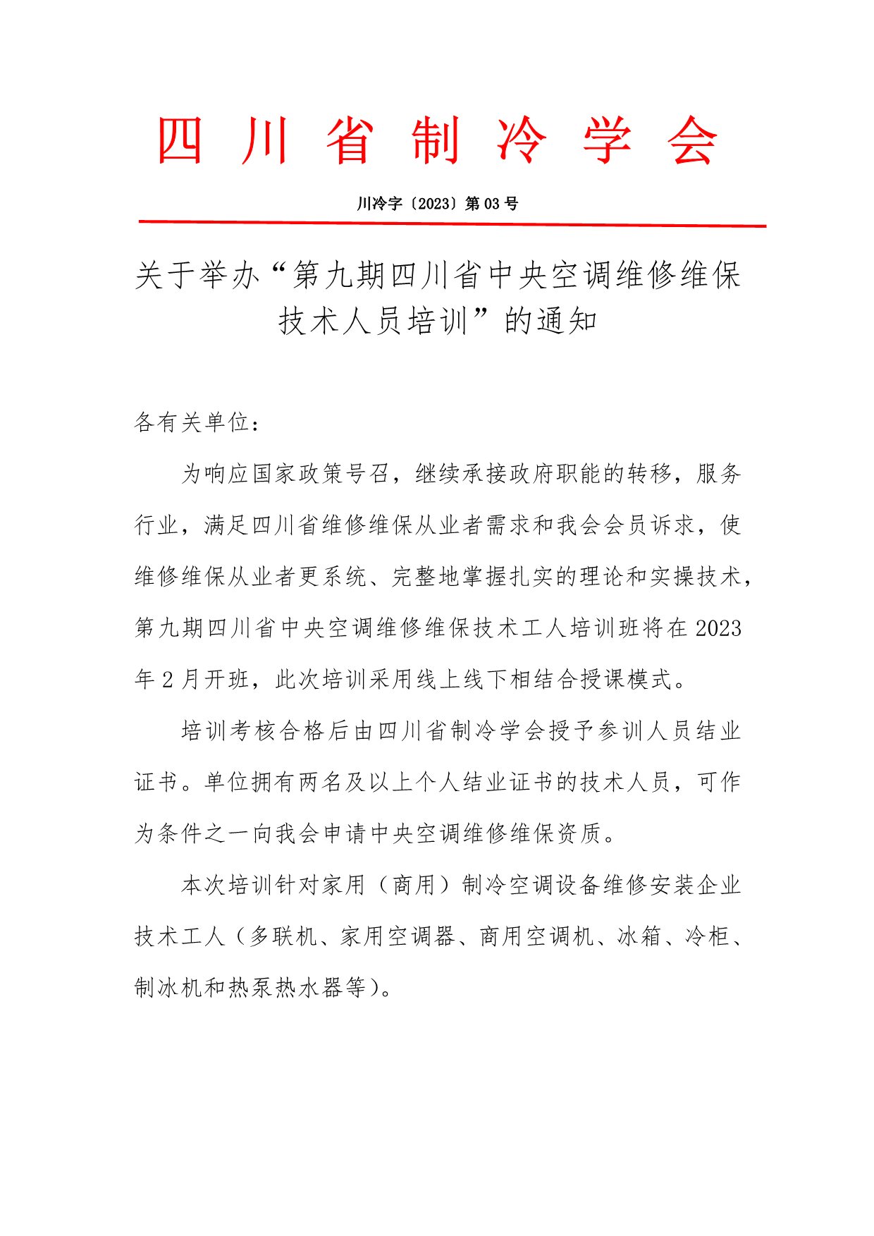 關于舉辦“第九期四川省中央空調維修維保技術人員培訓”的通知