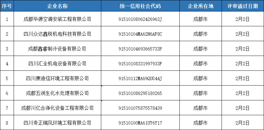 我會對第六批申請四川省空調通風系統專業清洗企業資質證書的申報材料組織了專家審查,現將符合專家審查意見的企業名單在四川省制冷學會門戶網站(http://www.dghenry.com/)予以公示,以廣泛接受社會監督。公示截止日期為2021年2月5日。